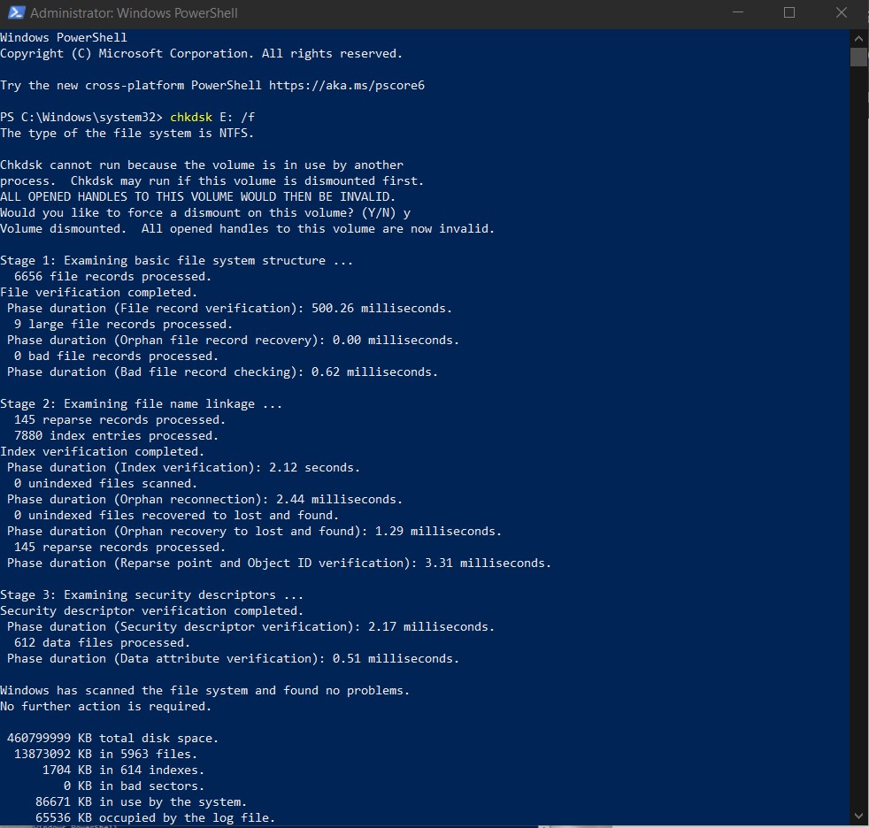 Khởi động Windows PowerShell (Admin). Nhập lệnh "chkdsk Tên_phân_vùng: /f". Trong đó là "Tên_phân_vùng" là tên của phân vùng ổ đĩa cần kiểm tra. Ở đây ví dụ là "E" thì câu lệnh hoàn chỉnh sẽ là: "chkdsk E: /f". Sau đó hãy nhấn phím ENTER để thực thi lệnh.