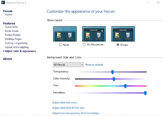 Khả năng chính của Fences giúp bạn tạo layout để bào vào đấy cac icon, shortcut của phần mềm nhìn gọn gàng hơn, phân chia theo từng tad, từng ô. Nếu như bạn là người hay bày ra ngoài màn hình máy tính, nó sẽ rất rối thì Fences sẽ giúp bạn tạo các layout riêng, ví dụ như các tad dành riêng cho game, cho công việc, hình ảnh. Ngoài ra việc ẩn hiện icon cực kỹ dễ dàng, chỉ cần double click vào trong màn hình destop mà thôi.