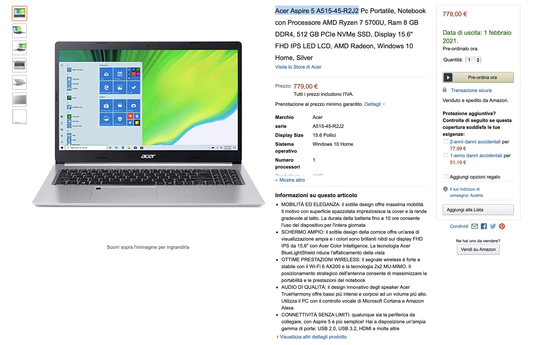 Vào thời điểm người viết lần đầu tiên phát hiện ra thông tin này, mức giá của Acer Aspire 5 A515 được ghi là €779 (xem ảnh chụp màn hình bên trên). Trạng thái này sau đó đã thay đổi thành "Không khả dụng vào thời điểm hiện tại".