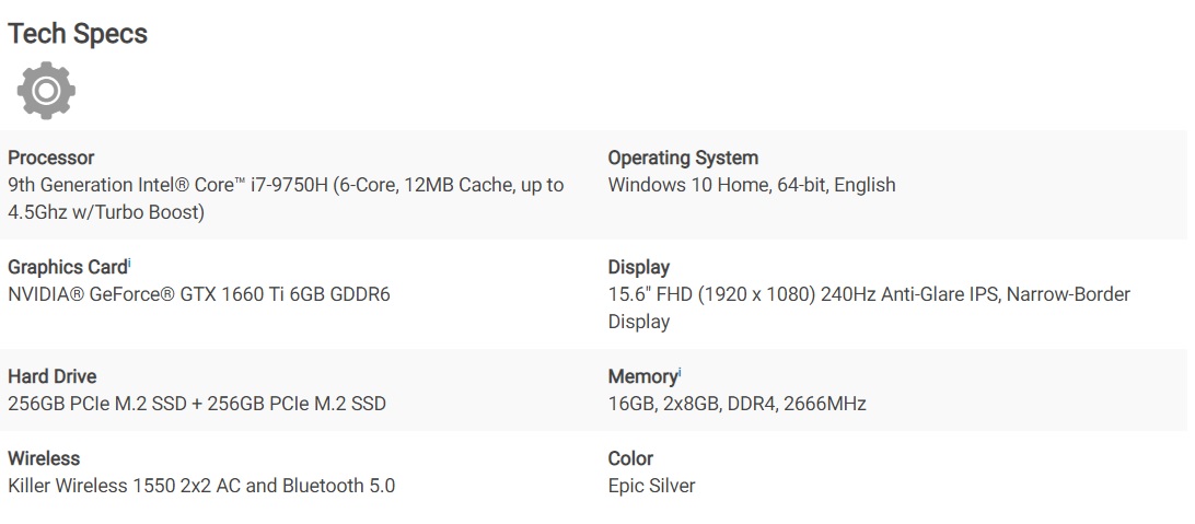 Alienware m15 R1 được trang bị bộ xử lý Intel Core i7-9750H, bộ nhớ RAM DDR4 16 GB, một cặp SSD NVMe 256 GB và card đồ họa Nvidia GeForce GTX 1660 Ti, cấu hình m15 này đủ sức cấp hiệu suất 1080p tầm trung tốt.