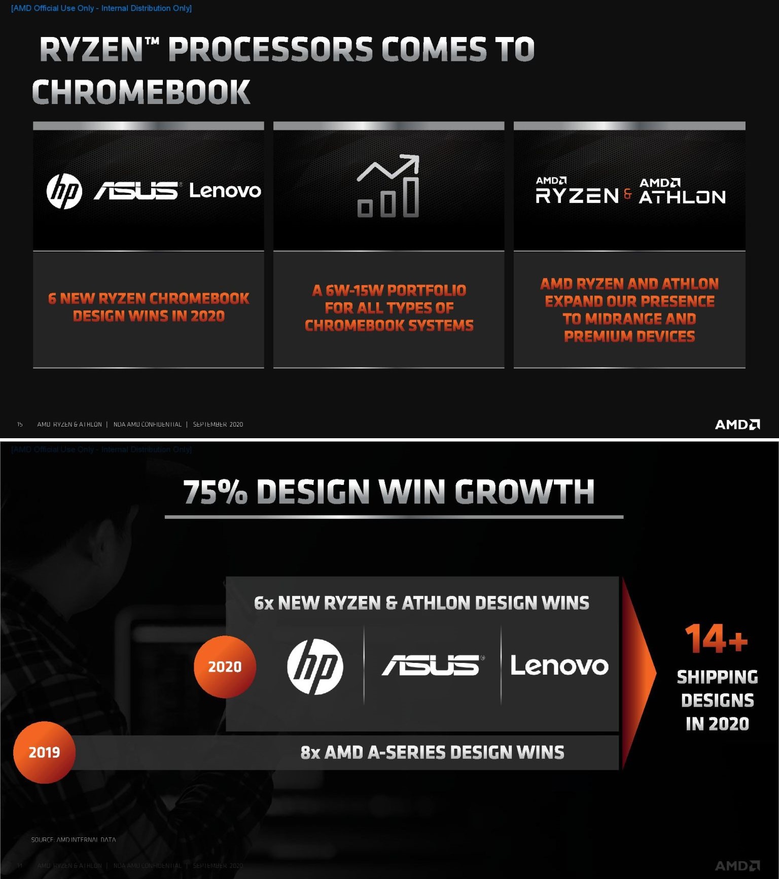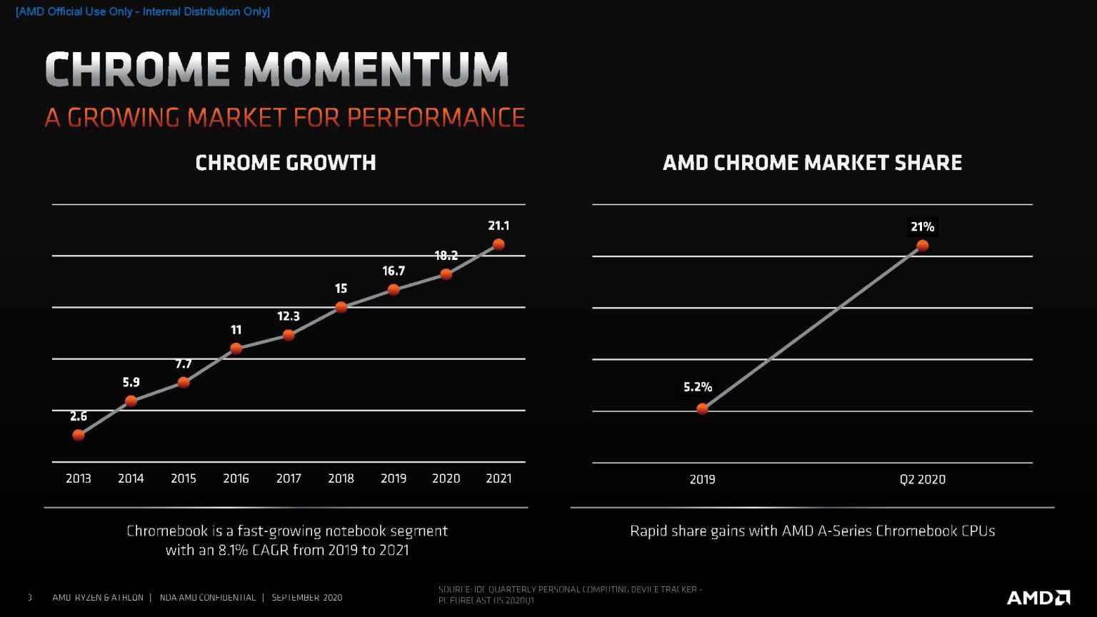 Bất chấp thị trường cạnh tranh bị thống trị bởi các giải pháp như Atom của Intel, Tegra của Nvidia và Mediatek, AMD vẫn nỗ lực tăng thị phần trong mảng Chromebook đang phát triển từ 8% vào năm 2019 lên 21% vào năm 2020. AMD cũng cho biết phân khúc này có tốc độ tăng trưởng hằng năm kép (CAGR) là 8%.
