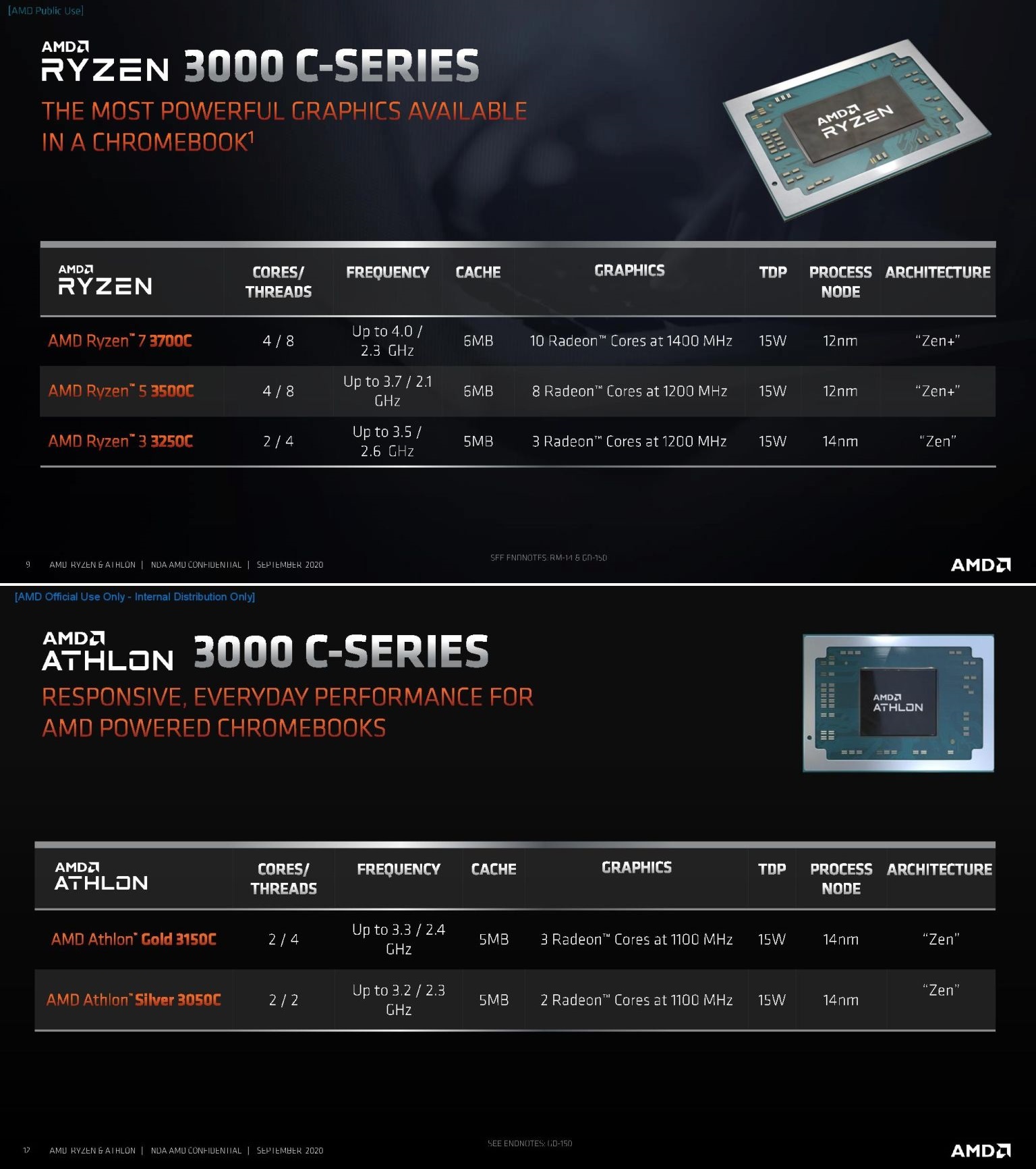 Vi kiến trúc Zen được ca ngợi của AMD và quy trình TSMC 14nm cuối cùng đã đến với Chromebook, dưới dạng bộ vi xử lý Ryzen và Athlon 3000 C-Series mới do công ty sản xuất. Những con chip này hỗ trợ đến 4 nhân, 8 luồng dựa trên thiết kế Zen+ đi kèm đồ họa tích hợp Vega. Giải thích ngắn gọn: Chữ "C" ở đây mang nghĩa chúng được dùng trong máy Chromebook.