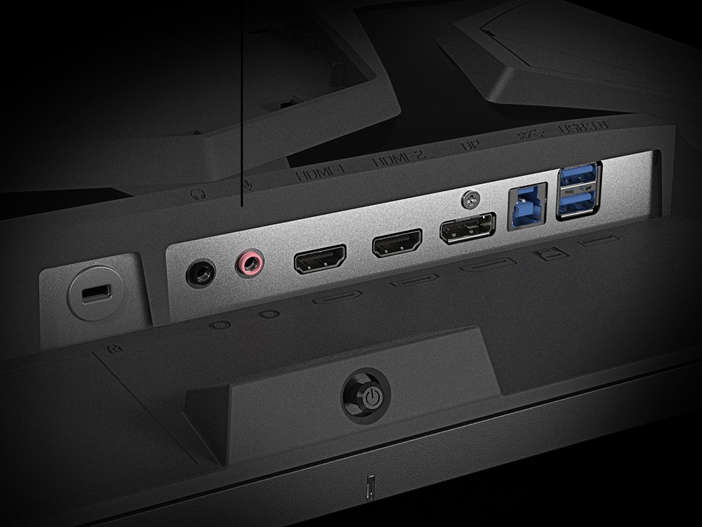 Thiết bị cũng có một số lượng cổng kết nối đa dạng: hai cổng HDMI 2.0, Display Port 1.2, hai cổng USB 3.0 (downstream), giắc cắm micrô + tai nghe 3,5 mm, cùng với khóa Kensington. Dĩ nhiên, không thể bỏ qua hệ thống LED RGB ở mặt lưng màn hình.