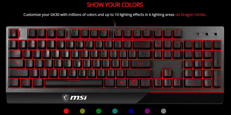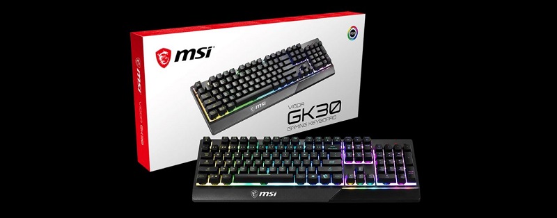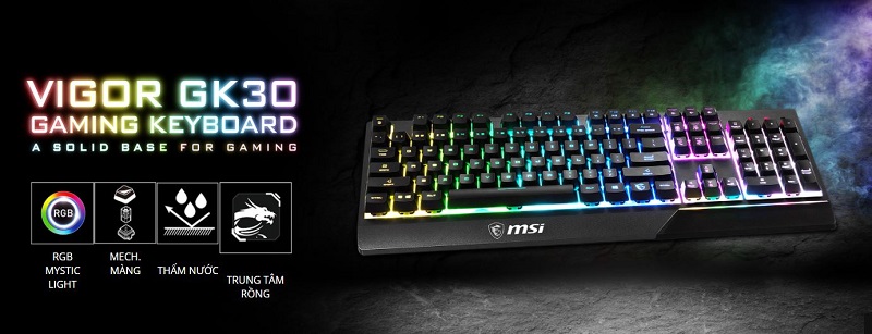 - MSI nổi tiếng với các dòng laptop gaming ngoài ra còn chế tạo ra Vigor GK30 vào năm 2019 đã thổi vào lòng các game thủ và dân đam mê công nghệ một làn gió nóng khiến mọi người rạo rực đứng ngồi không yên với chiếc bàn phím được thiết kế chống thấm nước cùng các hiệu ứng ánh sáng RGB sặc sỡ tuyệt đẹp trong 6 khu vực. Tuyệt vời hơn khi có thể kết nối tới các thiết bị điện tử như PC, laptop ... chỉ với đầu USB 2.0 mà không cần dây cáp.