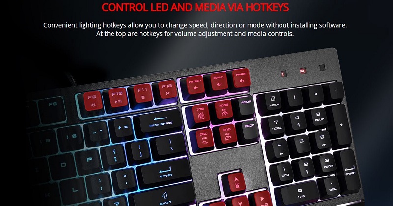 - Bàn phím Fullsize có 108 phím và được trang bị các phím nóng tiện lợi cho phép người dùng dễ dàng thay đổi tốc độ, điều hướng hoặc chế độ mà không cần vào phần cài đặt trên phần mềm. Ở hàng trên cùng bàn phím là các phím dùng để điều chỉnh âm lượng, điều khiển phương tiện.