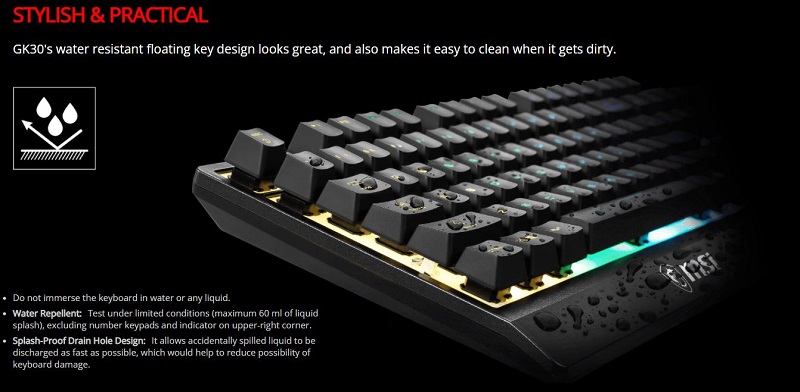Mang một phong cách riêng biệt khi được hãng lắp đặt phím nổi có khả năng chống thấm nước của GK30 vô cùng đặc sắc và có thể giúp người dùng thuận tiện hơn trong việc lau chùi bụi bẩn khi dọn dẹp. Khả năng chống thấm nước của bàn phím MSI được thử nghiệm trong các điều kiện hạn chế như tối đa 60ml chất lỏng văng tung tóa lên máy, nước có thể thoát ra ngoài khi sơ ý làm đổ nước một cách nhanh nhất có thể giúp giảm khả năng hư hỏng, chạm mạch của bàn phím. Phần cạnh dưới có logo đặc trưng của MSI nhưng chỉ là in lên nên khi kê tay thao tác nhiều trong khoảng thời gian dài logo có thể phai mờ. Mặt đế của bàn phím cứng cáp ngay dưới thanh dấu cách mang lại khả năng hỗ trợ và cải thiện hiệu suất chống trượt khi chiến các trận game và khi làm việc.