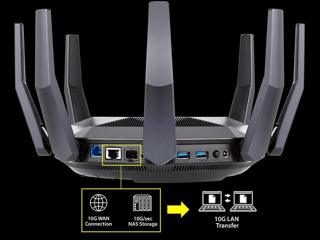 "RT-AX89X đi kèm với hai cổng 10G: một cổng Base-T và SFP +, nghĩa là cả kết nối cáp quang (fiber) 10G và cáp đồng (copper) 10G đều được hỗ trợ. Tận dụng tối đa tốc độ mạng mà nhà cung cấp dịch vụ (ISP) quảng cáo hoặc sử dụng mạng LAN 10G của riêng bạn giữa các PC và NAS", ASUS giải thích.