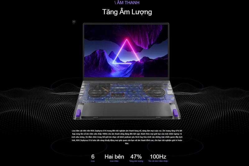- Âm thanh sống động từ hệ thống loa trầm cải tiến trên ROG Zephyrus G16 mang đến âm lượng tăng lên 47%, kết hợp cùng tần số âm trầm thấp 100Hz. Điều này tạo ra một không gian âm thanh bùng nổ, từ những giai điệu âm nhạc sâu lắng đến những trận chiến game kịch tính, đều được tái hiện một cách chân thực và đầy cảm xúc. Dù máy chỉ có kích thước 16 inch, nhưng âm thanh phát ra vẫn mạnh mẽ và rõ ràng nhờ vào hệ thống 6 loa xung quanh, thách thức mọi giới hạn của một chiếc laptop mỏng nhẹ.