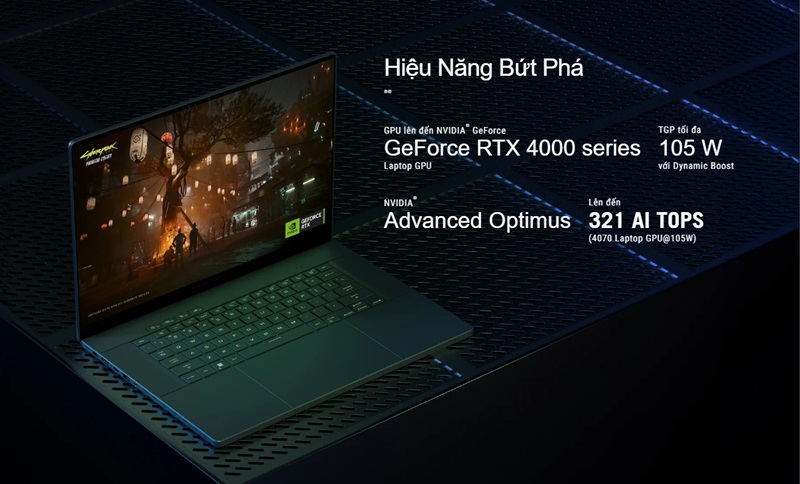 - Card đồ họa rời VGA NVIDIA GeForce RTX 40 series, cung cấp khả năng xử lý đồ họa ấn tượng. Người dùng có thể tận hưởng những tựa Game AAA mới nhất với mức đồ họa cao mà không phải lo lắng về tình trạng giật lag. Công nghệ Ray Tracing thời gian thực và AI tích hợp giúp tăng cường chất lượng hình ảnh, mang lại trải nghiệm chân thực và sống động. Đối với những người làm đồ họa hay sáng tạo nội dung, card đồ họa này còn giúp tối ưu hóa các ứng dụng dựng hình 3D, render video hoặc thiết kế đồ họa phức tạp.