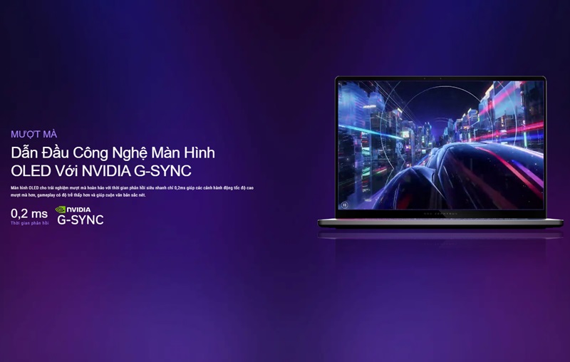 - Các công nghệ hiển thị tiên tiến như G-Sync và ROG Nebula HDR Display giúp tối ưu hóa độ sáng và độ tương phản của màn hình, mang lại trải nghiệm hình ảnh tốt nhất trong mọi điều kiện ánh sáng. G-Sync giúp đồng bộ hóa tốc độ làm tươi giữa màn hình và GPU, loại bỏ hiện tượng xé hình và đảm bảo hình ảnh mượt mà hơn trong các tựa game đòi hỏi đồ họa phức tạp.