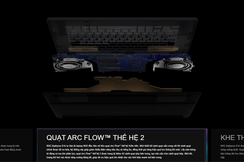 - Quạt Arc Flow™ thế hệ 2 là một trong những công nghệ tản nhiệt tiên tiến của Asus, giúp tối ưu hóa luồng không khí và giảm thiểu tiếng ồn. Các quạt này được thiết kế với lưỡi quạt mới, cải thiện khả năng di chuyển không khí và hiệu quả tản nhiệt. Keo tản nhiệt kim loại lỏng cũng được sử dụng để cải thiện khả năng truyền nhiệt từ các linh kiện đến bộ tản nhiệt, giúp tối ưu hóa hiệu suất làm mát và duy trì hiệu suất máy tính ổn định hơn. Keo tản nhiệt này không chỉ hiệu quả hơn mà còn giúp giảm tiếng ồn của hệ thống.