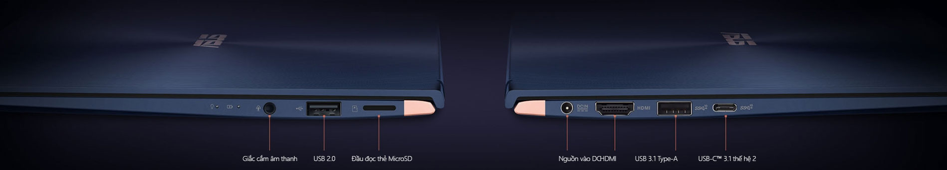 Trong khi làm việc di động, việc có thể kết nối với mọi thiết bị để trao đổi dữ liệu là điều thiết yếu. Laptop ASUS ZenBook 15 UX533FD-A9035T sẵn sàng làm việc khi được trang bị mọi cổng kết nối phổ thông như USB 3.1, USB 2.0, Audio jack, SD card reader, HDMI và USB C.