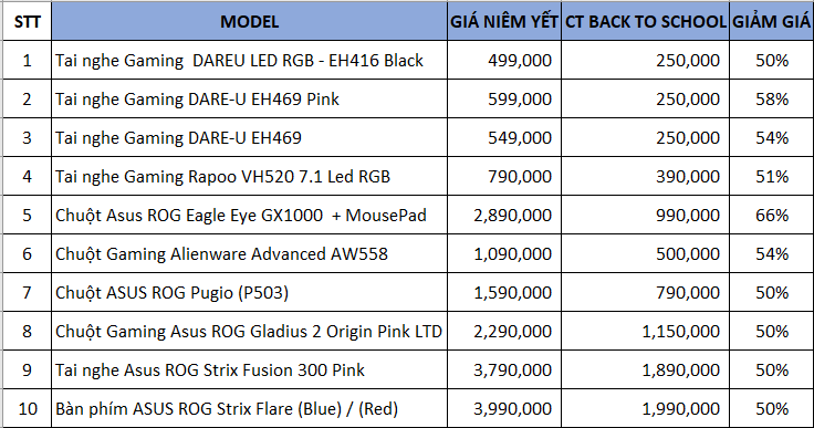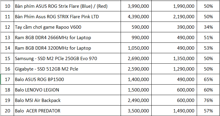 Dưới đây là bảng giá những linh kiện, phụ kiện được trợ giá upto 50% khi mua kèm Laptop trong chương trình Back to School 2020