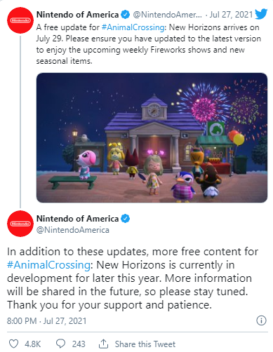 Trong một tweet thông báo về một bản cập nhật nội dung sắp tới khác, Nintendo xác nhận rằng họ thậm chí còn có nhiều nội dung hơn cho Animal Crossing: New Horizons đang được phát triển với mục tiêu ra mắt vào cuối năm nay.