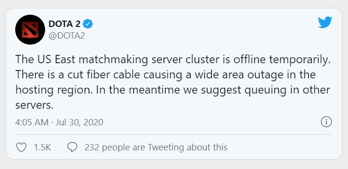 Người chơi Dota 2 và CS:GO ở phía đông Bắc Mỹ co thể đang thấy quá trình tìm trận (match making) của họ trở nên khó khăn hơn bình thường. Tuy nhiên, lần này không phải bởi một đợt tấn công DDoS, mà là một "ai đó" ngoài kia đã cắt đứt cáp theo đúng nghĩa đen, theo tài khoản chính thức của Dota 2 tuyên bố.