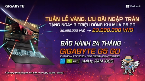 𝐓𝐮𝐚̂̀𝐧 𝐋𝐞̂̃ 𝐕𝐚̀𝐧𝐠, 𝐔̛𝐮 Đ𝐚̃𝐢 𝐍𝐠𝐚̣̂𝐩 𝐓𝐫𝐚̀𝐧   Gigabyte mang đến ưu đãi siêu hấp dẫn tặng ngay 3.000.000đ dành cho các bạn mua laptop đa năng Gigabyte G5 GD, giá chỉ còn 23.990.000đ  Sản phẩm áp dụng: https://laptopnew.vn/laptop-gigabyte-g5-gd-51s1223sh Trang bị: ▪️CPU Intel i5-11400H Gen 11th ▪️RAM 16GB DDR4 3200MHz (2 slot) ▪️Ổ cứng SSD 512GB M.2 PCIe ▪️Card đồ họa Nvidia Geforce RTX 3050 4GB GDDR6 + Intel UHD Graffiti Chương trình diễn ra từ ngày 23/02 - 06/03 --------------------------------------------- 𝐋𝐀𝐏𝐓𝐎𝐏𝐍𝐄𝐖.𝐯𝐧 - 𝐒𝐔̛̣ 𝐋𝐔̛̣𝐀 𝐂𝐇𝐎̣𝐍 𝐒𝐎̂́ 𝟏 𝐂𝐔̉𝐀 𝐁𝐀̣𝐍 🎧HOTLINE: 1800.7003 (Gọi miễn phí) ⏱TIME: 08:30 - 21:00 🚪29 Tân Thành, P12, Q5, TP.HCM 🚪399 Xô Viết Nghệ Tĩnh, P24, Bình Thạnh, HCM