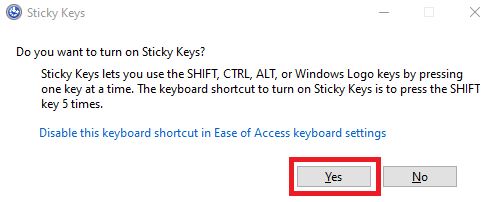 ✓ Ngoài ra, các bạn còn có thể kích hoạt nhanh tính năng Sticky Keys này bằng cách nhấn phím Shift 5 lần. Trên màn hình sẽ hiện ra thông báo hỏi bạn có muốn bật không thì bạn ấn Yes.