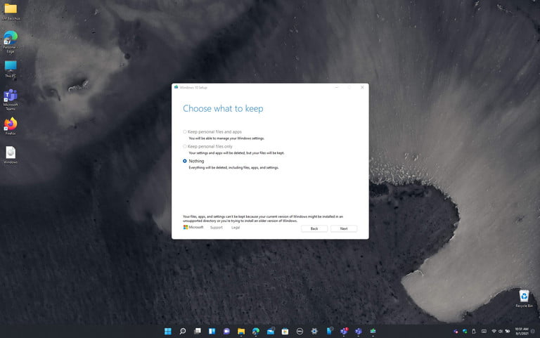 - Sau một vài lần khởi động lại, PC của bạn sẽ được đặt trở lại Windows 10 và sẽ không còn ở trên Windows 11. Đây là cách an toàn và dễ dàng nhất để quay lại Windows 10 vì nó giữ mọi thứ ở đúng vị trí. Bạn sẽ không mất bất kỳ tệp hoặc tài liệu nào của mình, nhưng bất kỳ ứng dụng nào bạn đã cài đặt trong khi sử dụng Windows 11 sẽ không còn nữa.