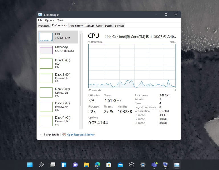 - Thay vào đó, bạn cũng có thể kiểm tra Trình quản lý tác vụ để xem thông số kỹ thuật hệ thống của mình. Chỉ cần nhấn Control + Alt + Delete trên bàn phím của bạn, sau đó chọn tùy chọn Task Manager. Trong trình quản lý tác vụ, bạn có thể xem trong phần Hiệu suất để xem tên CPU của mình. Nếu bạn nhấp vào Bộ nhớ, bạn sẽ thấy dung lượng RAM và tốc độ nó đang chạy. Trong khi đó, bên dưới Đĩa, bạn có thể thấy loại đĩa và trạng thái của đĩa.