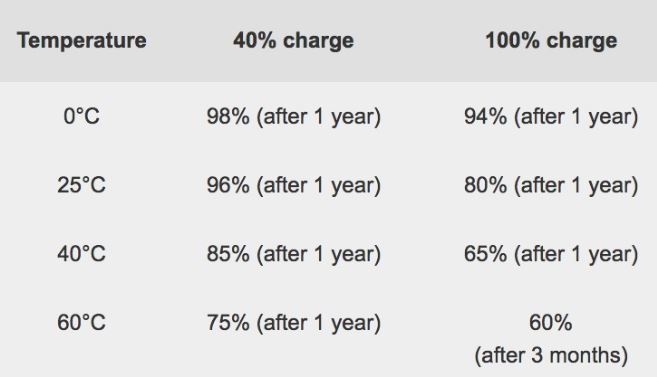 ✓ Dựa theo bản thống kê và thử nghiệm của trang Battery University cho biết thì nếu chúng ta giữ cùng mức sạc pin ở cùng một nhiệt độ cố định thì sau một khoảng thời gian, dung lượng pin chứa được sẽ bị giảm đi. Cụ thể thì trong bảng kết quả thử nghiệm bên dưới, bạn có thể thấy được là nếu chúng ta chỉ sạc pin tới 40% ở nhiệt độ 40 độ C thì sau 1 năm, bạn sạc tới 40% pin thì mức năng lượng thật sự trữ được trong pin chỉ có 85% của 40% mà thôi.