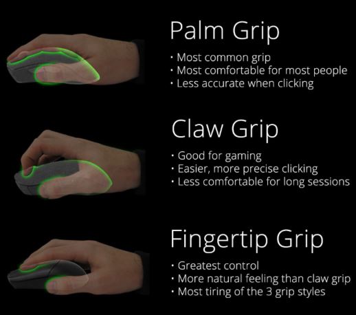 ✓ Claw grip: Đây là thói quen cầm chuột tiếp xúc bằng 6 điểm, bao gồm 5 đầu ngón tay và một ít ở lòng bàn tay, những ngón tay click chuột sẽ tào thành hình vòm. Với các dùng này bạn nên chọn các dáng chuột to, phần đế cao hơn 3 cm, dáng thon dài sẽ thuận tiện nhất.
