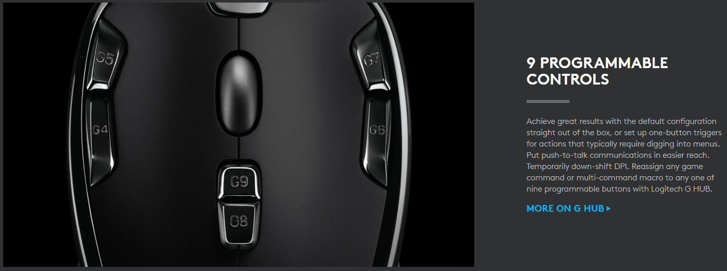 Đạt được kết quả tuyệt vời với cấu hình mặc định ngay lập tức hoặc thiết lập trình kích hoạt một nút cho các hành động thường yêu cầu đào sâu vào menu. Đưa thông tin liên lạc push-to-talk dễ dàng tiếp cận hơn. DPI tạm thời giảm xuống. Gán lại mọi lệnh trò chơi hoặc macro đa lệnh cho bất kỳ một trong chín nút có thể lập trình được với Logitech G HUB.