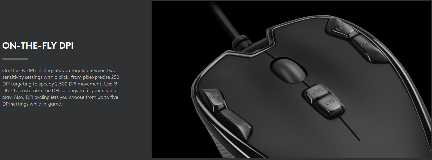 Chuyển đổi DPI nhanh chóng cho phép bạn chuyển đổi giữa hai cài đặt độ nhạy chỉ bằng một cú nhấp chuột, từ nhắm mục tiêu 250 DPI chính xác pixel đến chuyển động 2.500 DPI nhanh chóng. Sử dụng G HUB để tùy chỉnh cài đặt DPI cho phù hợp với phong cách chơi của bạn. Ngoài ra, chu kỳ DPI cho phép bạn chọn từ tối đa năm cài đặt DPI khi ở trong trò chơi.