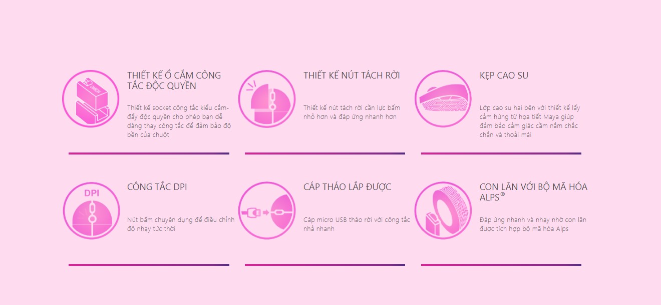 | Công nghệ | Công tắc Omron với độ bền 50 triệu lần bấm, cộng với hai công tắc Omron Nhật Bản phụ mang tới thêm một cảm giác chuột khác |