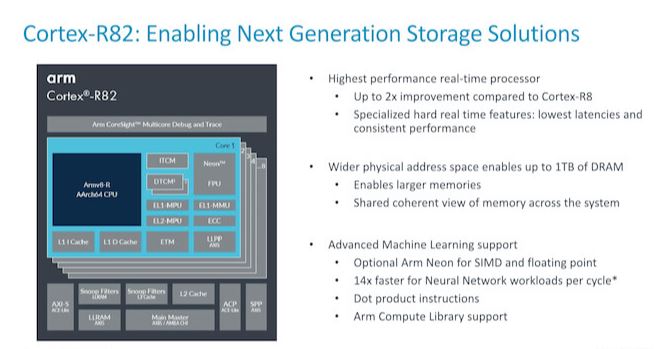 ✓ Arm Cortex-R82 có hiệu năng cao hơn gấp 2 lần (tùy theo tác vụ) so với Cortex-R thế hệ trước. Điều này sẽ cho phép các ứng dụng lưu trữ chạy các tác vụ mới như máy học (machine learning) với độ trễ thấp hơn. Cortex-R82 là chip 64-bit, cho phép truy cập đến 1 TB DRAM để xử lý dữ liệu trong các ứng dụng lưu trữ.