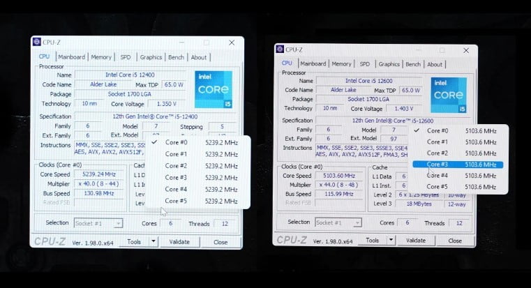 - Tốc độ xung nhịp của cả hai CPU đều tăng lên đáng kể. Core i5-12400 có tốc độ xung nhịp cơ bản là 2,5 GHz và tăng lên 4,4 GHz ở chế độ Turbo, nhưng khi được ép xung, nó lên tới 5,2 GHz. Bộ xử lý trông có vẻ hứa hẹn ngay từ đầu, cung cấp hiệu suất cao ở mức yêu cầu năng lượng thấp, vì vậy thật tuyệt khi thấy nó hoạt động tốt hơn nữa dưới áp lực. Đáng ngạc nhiên là Der8auer không thể đạt được cùng tần số trên Core i5-12600 tốt hơn một chút - anh ta chỉ ép xung bộ xử lý đó lên 5.1GHz.