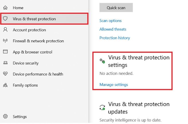 Bước 3: Một cửa sổ mới hiện lên, tại mục Virus & threat protection, bạn kéo xuống tìm mục Virus & threat protection settings rồi chọn dòng Manage settings.