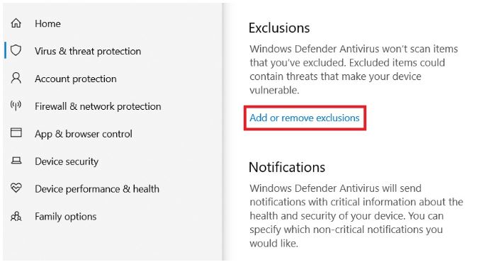 Bước 4: Kéo xuống tìm mục Exclusions rồi chọn dòng Add or remove exclusions.