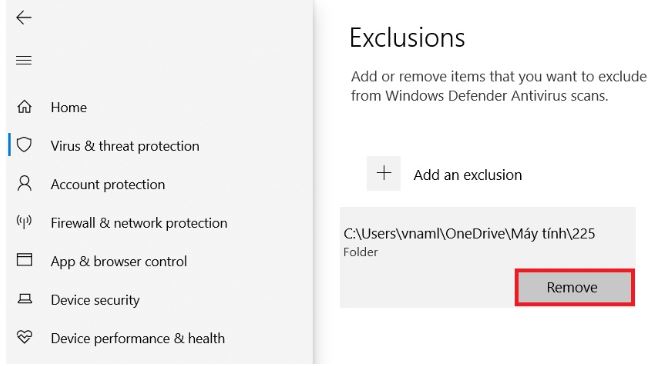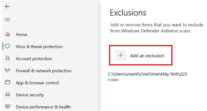 Bước 5: Bấm vào Add an exclusion rồi chọn file hoặc thư mục mà bạn muốn đặt cách.
