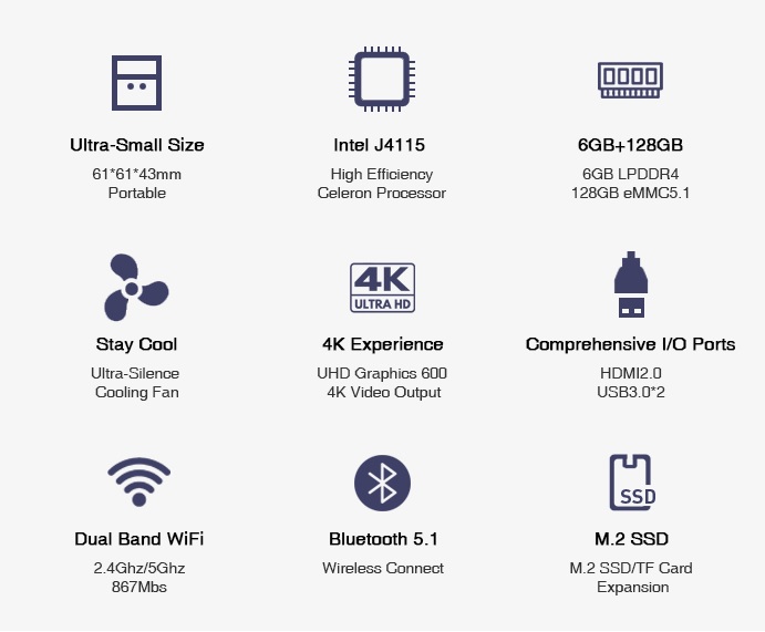 Về thông số cấu hình, chiếc LarkBox được cung cấp sức mạnh bởi bộ xử lý Intel Celeron J4115, RAM 6 GB LPDDR4 và ổ cứng lưu trữ eMMC5.1 128GB. Dành cho bạn đọc nào chưa biết thì Celeron J4115 là con chip lõi tứ với xung nhịp cơ bản 1,8 GHz (có thể tăng lên 2,4 GHz) cùng hệ thống đồ họa UHD 600. Ngoài ra, nó còn có một khe M.2 để người dùng nâng cấp dung lượng lưu trữ với ổ SSD lớn hơn và nhanh hơn nếu muốn.