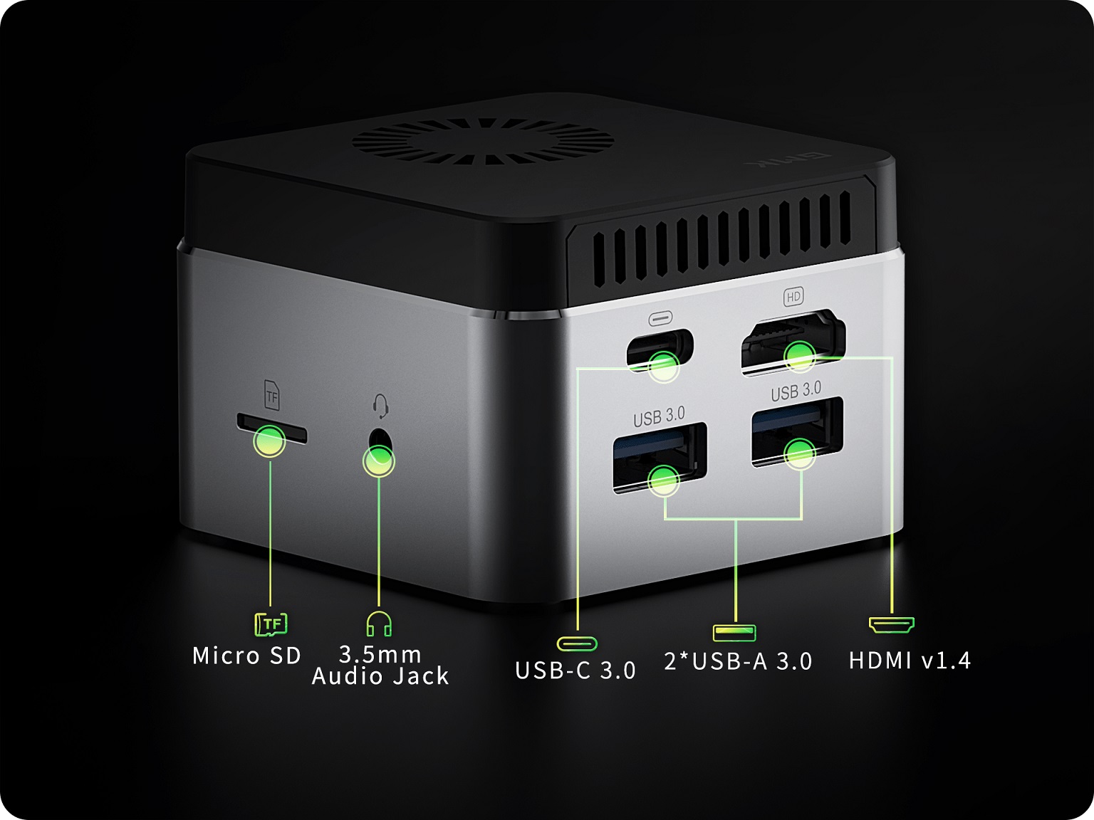 Việc sử dụng ổ SSD thay HDD cũng góp phần tăng hiệu suất cho chiếc NucBox 4K mini, giúp giảm thời gian khởi động cũng như chạy ứng dụng. Thiết bị hỗ trợ WiFi băng tần kép cho tốc độ lên đến 867MB và tích hợp 1 cổng HDMI v1.4, 2 cổng USB 3.0, 1 cổng Type-C, giắc cắm tai nghe cùng thẻ nhớ microSD.