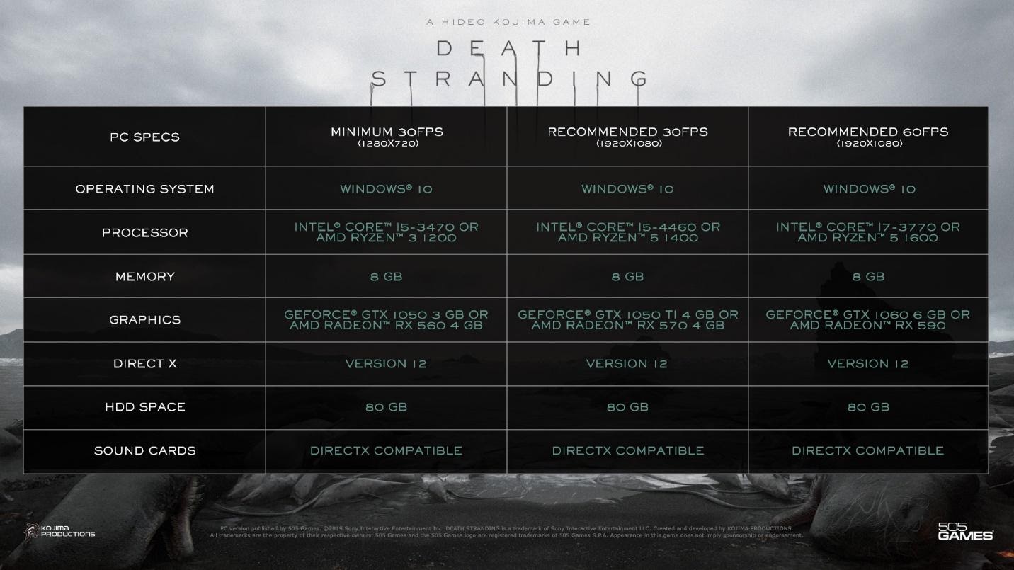 Tựa game “mô phỏng đi bộ” đình đám sẽ cập bến PC thông qua nền tảng Steam vào ngày 14/07/2020. Mới đây, 505 Games và Kojima Productions đã tiết lộ cấu hình yêu cầu để chơi được tựa game này.