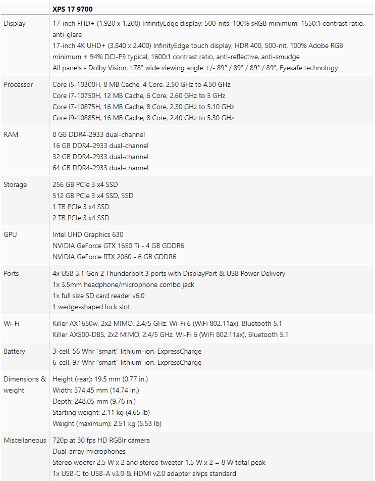 Đây được coi là chiếc laptop dòng XPS mạnh nhất từ trước đến nay, XPS 17 9700 là sản phẩm đầu tiên trong dòng sản phẩm có GPU GeForce RTX 20 tùy chọn. Dell cũng đã trang bị cho XPS 17 9700 bộ xử lý Comet Lake-H với tùy chọn cao nhất là Core i9-10885H.