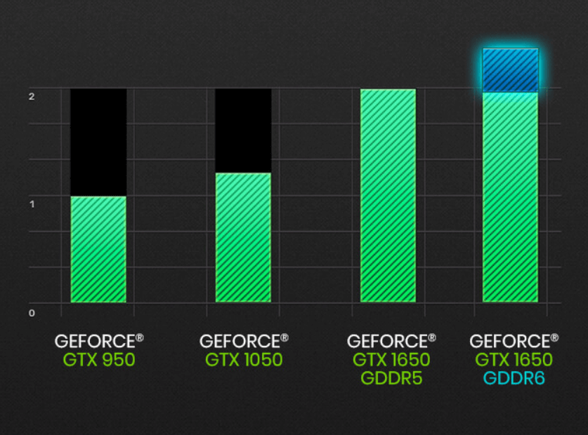Bên cạnh đó EVGA cung cấp một biểu đồ giản lược hiển thị khả năng của những chiếc card tầm trung trước đó đã được cải thiện như thế nào qua các năm, từ GeForce GTX 950, GeForce GTX 1050, GeForce GTX 1650 với GDDR5 cho đến GeForce GTX 1650 mới nhất với GDDR6.