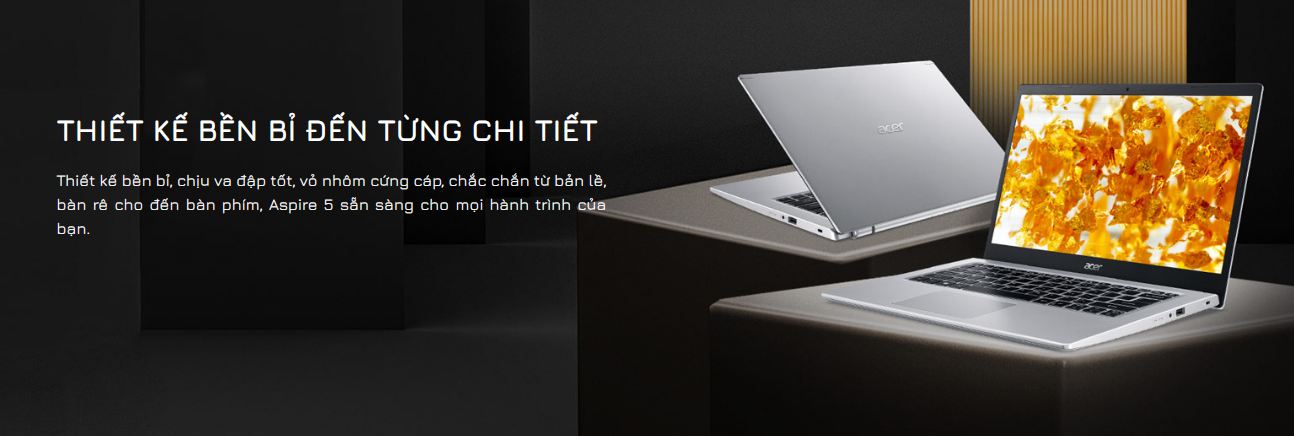 - Thiết kế bền bỉ, chịu va đập tốt, vỏ nhôm cứng cáp, chắc chắn từ bản lề, bàn rê cho đến bàn phím, Aspire 5 sẵn sàng cho mọi hành trình của bạn.