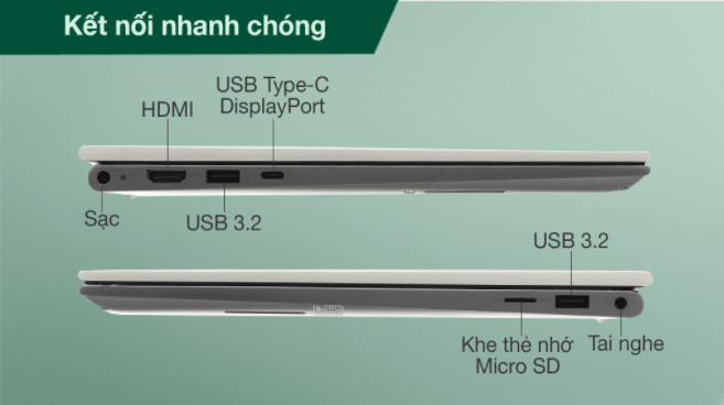 Máy được trang bị đầy đủ các cổng giao tiếp thông dụng. Ở cạnh trái có một cổng HDMI riêng biệt, cổng USB 3.2, cổng sạc laptop và một cổng hỗ trợ sạc nhanh USB Type C. Bên cạnh phải trang bị khe thẻ nhớ Micro SD, cổng USB 3.2 và jack cắm tai nghe.
