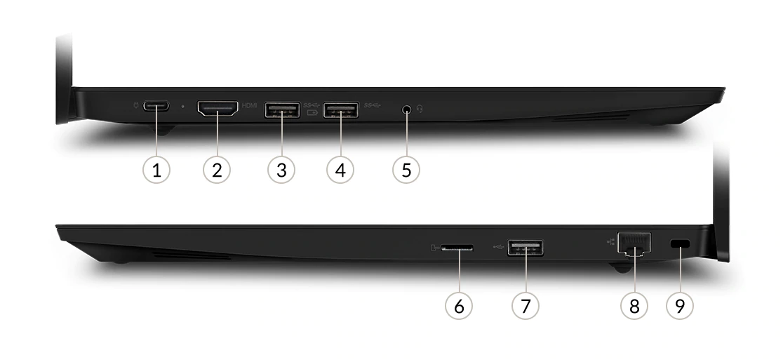Máy e15 lenovo cũng được trang bị đầy đủ các cổng kết nối thông dụng. Cạnh trái có cổng USB, cổng HDMI, jack cắm tai nghe và cổng USB có hỗ trợ sạc cho các thiết bị khác. Ở cạnh phải có một cổng USB, cổng mạng LAN RJ45.
