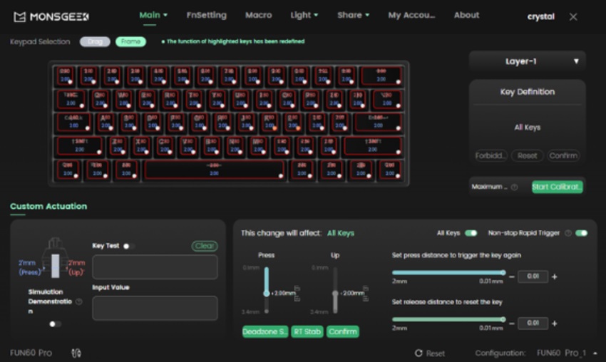 - Một trong những điểm nổi bật nhất về trải nghiệm gõ của FUN60 Pro chính là tính năng Rapid Trigger – cho phép phím kích hoạt lại ngay khi người dùng vừa bắt đầu thả phím, không cần chờ phím “reset” về vị trí ban đầu như trên switch cơ học thông thường. Điều này đặc biệt hữu ích trong các tựa game bắn súng hoặc hành động đòi hỏi tốc độ xử lý cao, nơi từng phần nghìn giây có thể tạo ra sự khác biệt rõ rệt.