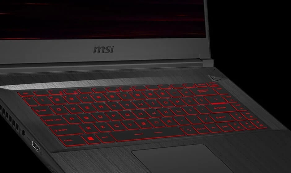 Laptop msi gf65 sử dụng Chiclet keyboard with LED với độ nhạy cao, khả năng gõ phím chính xác, cảm giác gõ nhẹ nhàng, âm thanh không quá ồn ào. Với thiết kế với led đỏ nổi bật trên nền bàn phím đen. Màu sắc đỏ đen tương phản so với tổng thể máy cho khả năng nhận dạng phím tốt trong điều kiện thiếu sáng, font chữ trên keycap rõ ràng xuyên led cho trải nghiệm gaming trong đêm trở nên thú vị hơn rất nhiều.
