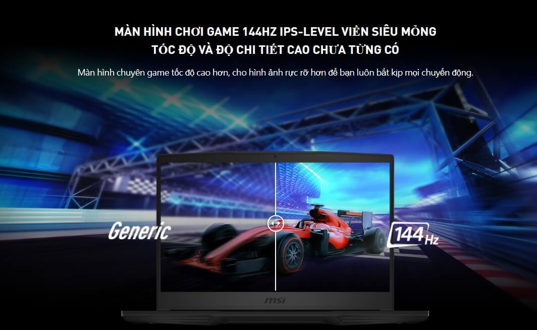 - Msi gf65 10ue sử dụng màn hình 15.6-inch FHD IPS (1920x1080) with 144Hz, close to 100% sRGB, viền mỏng cho người dùng có cảm giác góc nhìn rộng hơn, hình ảnh rõ ràng, sắc nét hơn. Màn hình IPS với tần số quét 144Hz nhanh chóng bắt nhịp mọi chuyển động trên màn hình, màn hình này sẽ giúp bạn không bỏ lỡ một nhịp nào khi đang trong trận chiến, từng hình ảnh sống động từ màn hình cũng đem đến sự hưng phấn khi sử dụng.
