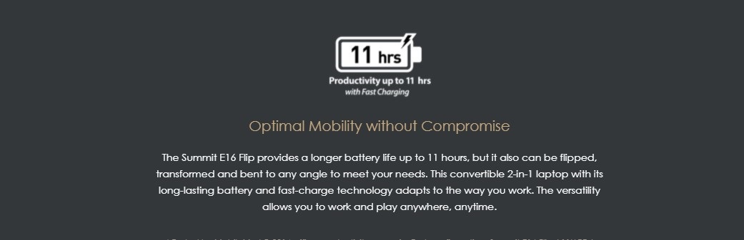 - Summit e16 flip có thời lượng pin dài bất ngờ lên đến 11 giờ, nhưng nó cũng có thể lật, biến đổi và uốn cong theo bất kỳ góc độ nào để đáp ứng nhu cầu của bạn. Máy tính xách tay 2 trong 1 có thể chuyển đổi này với pin lâu dài và công nghệ sạc nhanh đáp ứng mọi nhu cầu công việc.