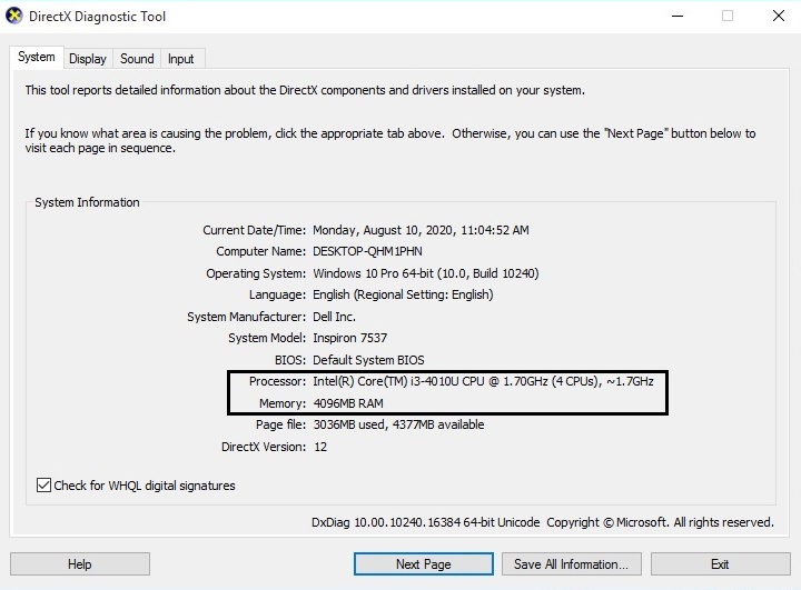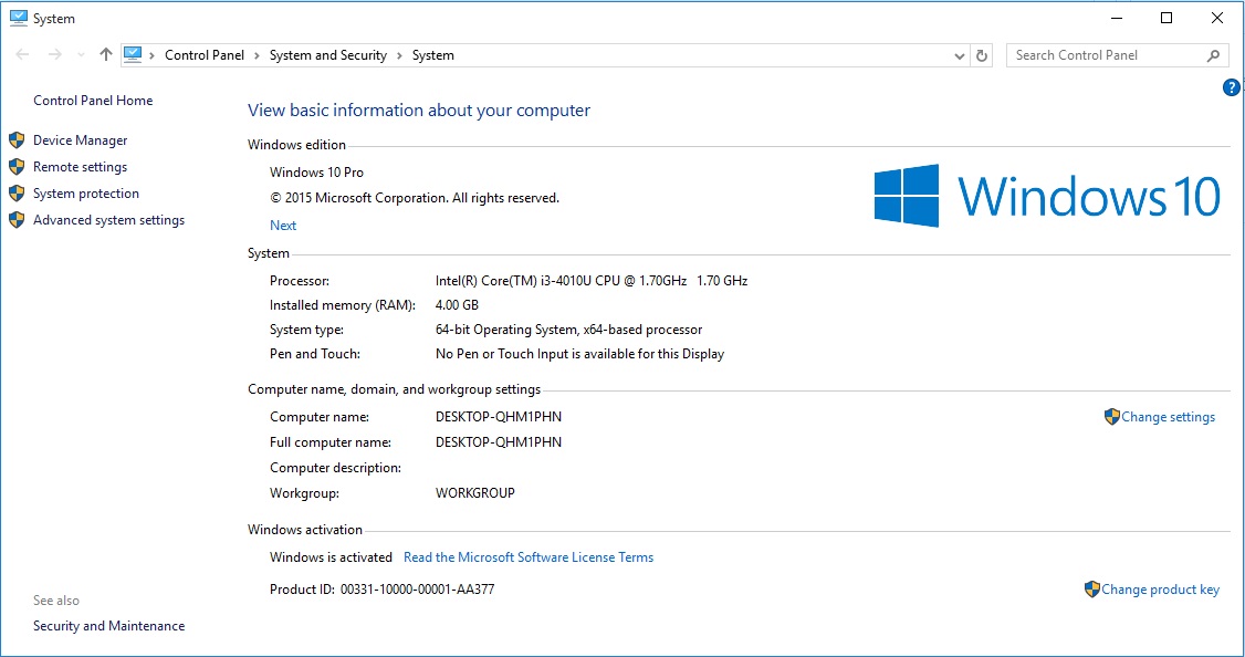 Processor: Inter(R) Core(TM)i3-4010U CPU @ 1.70GHz (4CPUs), ~1.7GHz.