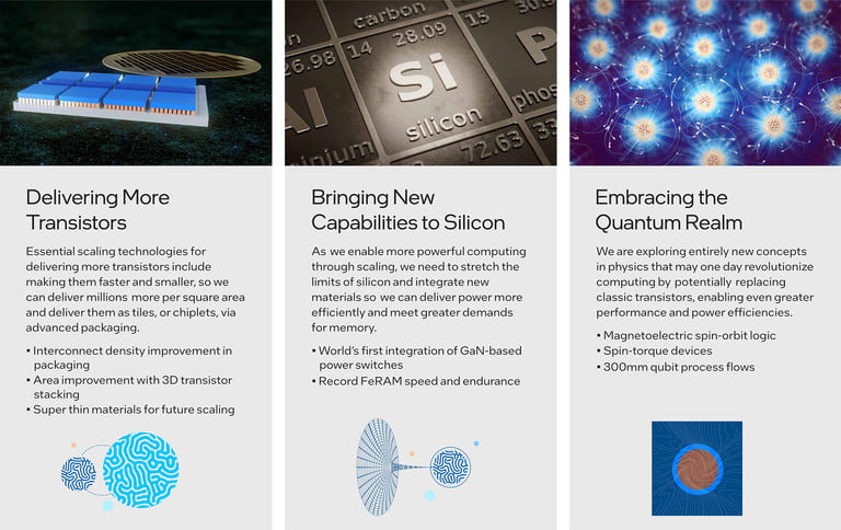 - Intel đã phát hành một thông cáo báo chí, tiết lộ nhiều tiến bộ khác nhau trong lĩnh vực đóng gói, bóng bán dẫn và vật lý lượng tử. Công ty đã tuyên bố rằng những phát hiện mới này được thực hiện để theo đuổi Định luật Moore.