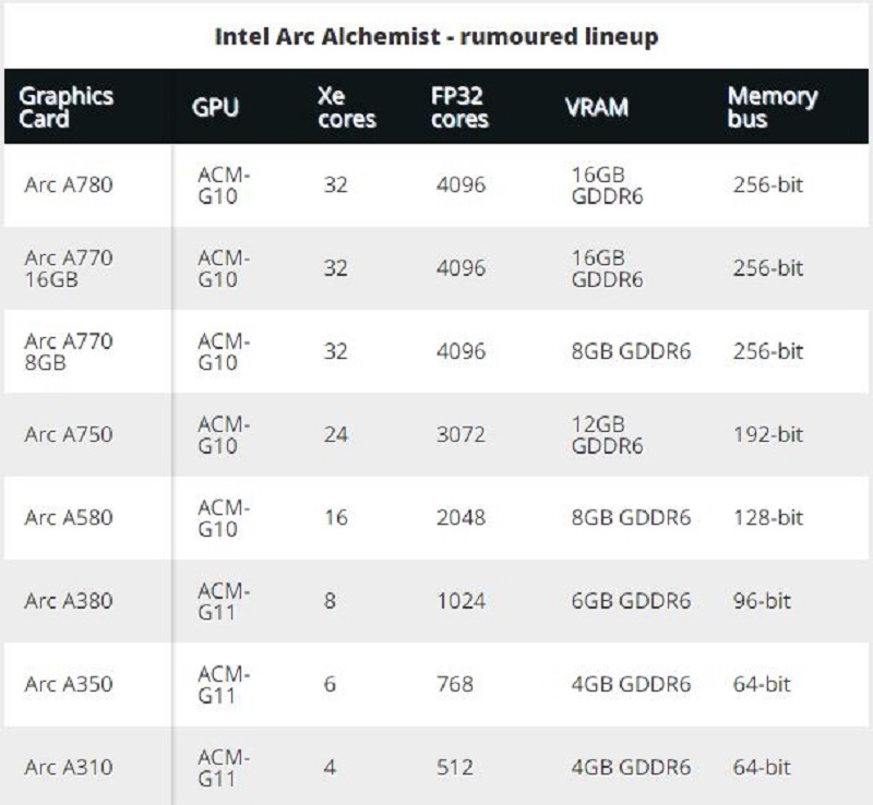 Leaker Komachi cho rằng Intel sẽ đưa ra thị trường 8 loại card đồ họa khác nhau. Có tới 7 sản phẩm GPU khác nhau nhưng trong đó chỉ có A770 có sẵn trong cả hai phiên bản 8GB và 16GB. Đó là nhiều thẻ hơn chúng tôi mong đợi, đặc biệt là chỉ một thẻ duy nhất có thể tạo ra sự khác biệt trong thời gian vẫn còn thiếu silicon này.