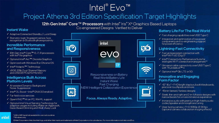 - Thông số kỹ thuật Evo 3 của Intel sẽ yêu cầu máy tính xách tay phải cung cấp bộ vi xử lý Intel thế hệ thứ 12, kết nối Wi-Fi 6E cùng với Bộ hiệu suất kết nối Intel để tự động ưu tiên lưu lượng truy cập internet, khử tiếng ồn nền dựa trên AI, đánh thức tức thì, cải thiện hiệu suất và khả năng phản hồi, pin lâu cuộc sống và ít nhất một webcam 720p. Intel Visual Sensing là tùy chọn.
