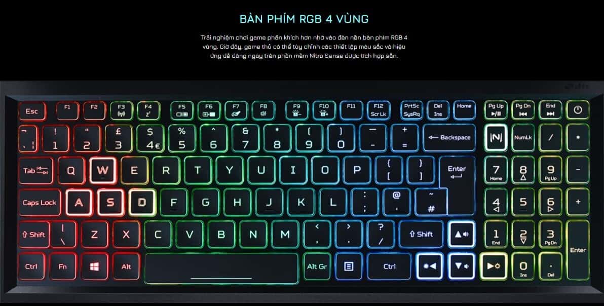 Nitro 5 AN515 R9JM có bàn phím full size, layout sắp xếp khá quen thuộc, tích hợp được nhiều chức năng trong cùng một phím, nút nguồn được đặt chung trên khung bàn phím, được trang trí đèn led RGB bốn vùng vô cùng thú vị, đẹp mắt, dễ dàng tùy chỉnh led, 4 phím chuyên dụng WASD và phím tắt mở Nitro Sense được viền nổi bật hơn các phim xung quanh.